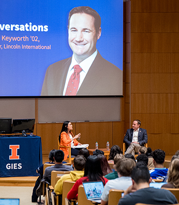 Gies College of Business welcomed alumnus Brad Keyworth (FIN '02) to share his insights at the Gies Conversations series on November 5. The series is a BUS 401 capstone event designed to connect learners with alumni leaders who speak candidly about life beyond graduation and their path to purpose. Moderators Sandra Corredor and Heather Swenddal guided a conversation that moved from Brad’s early career choices to leadership, culture, and the importance of purpose.